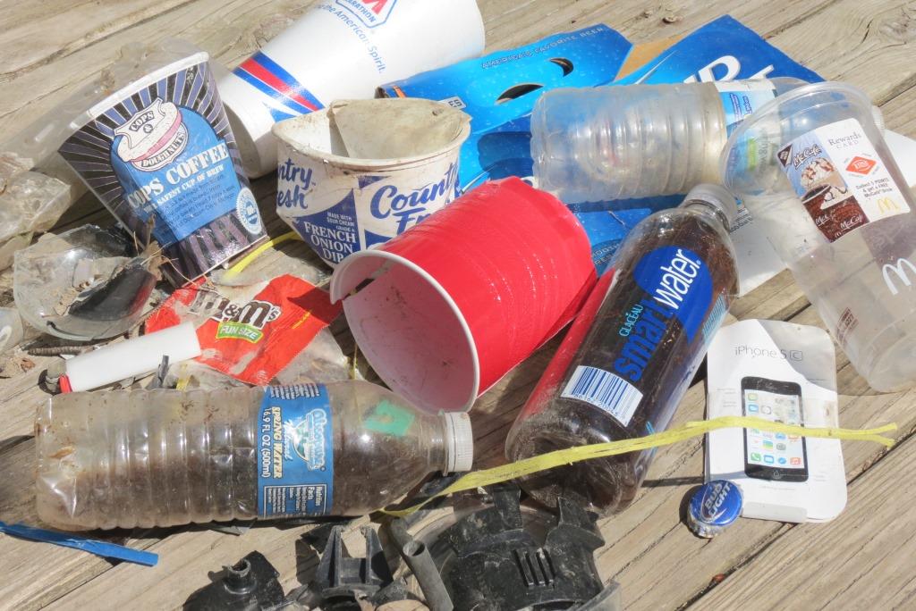 Mc cafe, smart water, bud lite, iphone 5 paper, cops & doughnuts cup, marathon cup, country fresh tub, M&M wrapper, lighter, caps, plastic car parts, yellow plastic strapping, green bread tie, Gatorade, absopure water bottle, red solo cup, clear sheet plastic, cig butts, tobacco chew spit bottles…