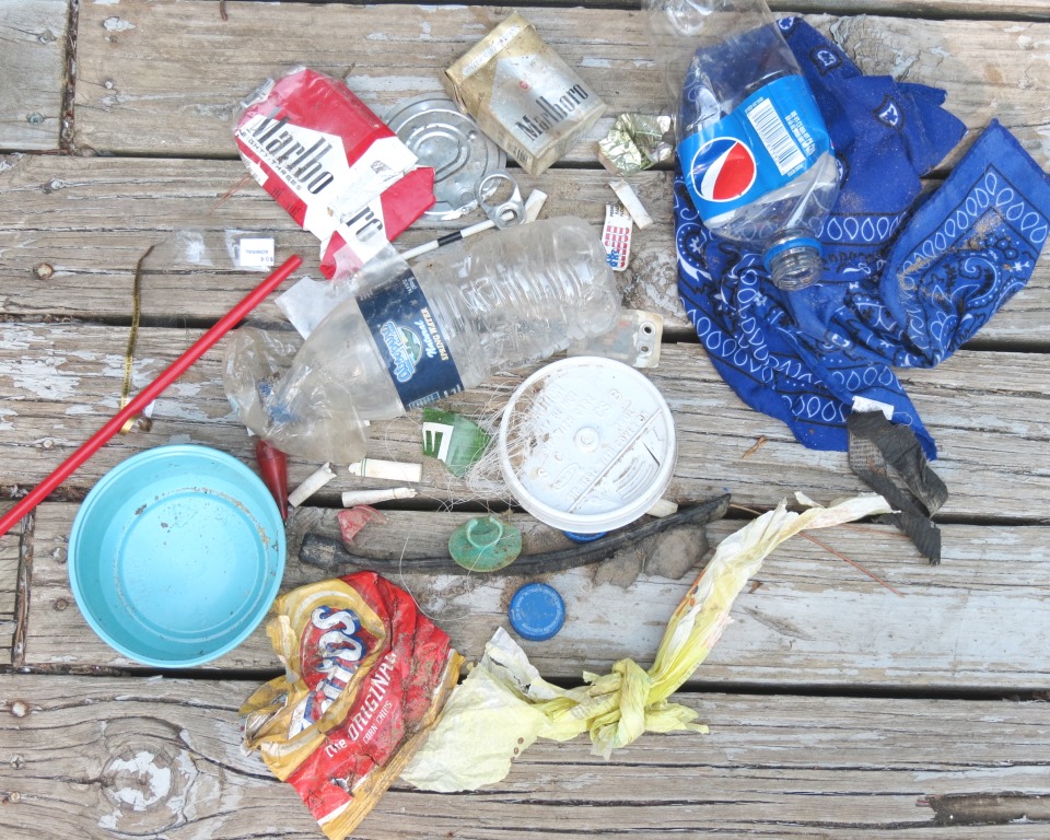 June 10 2015 Bandana,electrical tape, #mcdonalds wrapper, #fritos bag, tire bit, ring pop plastic, rubber bits, coffee lid, worm tub, fishing bobber, fishing line, bottle caps, #pepsi bottle, #absopure water bottle, plastic bits, straw, 2 #marlboro packs, metal can top, Glass shard…..