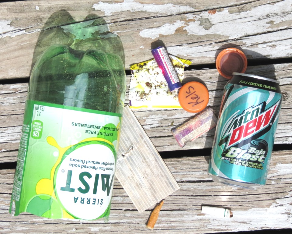 #sierramist bottle, #mtndew can, 2 orange caps, cig butts, 2 fireworks pieces, taffy candy wrapper, and piece of plastic with large metal staple.
